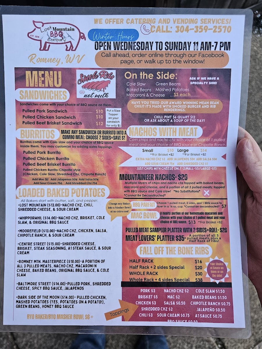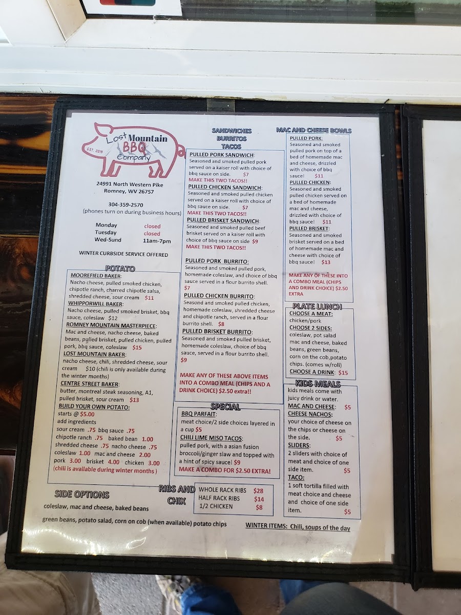 At Lost Mountain BBQ Company, located at 24991 Northwestern Turnpike in Romney, WV, the menu offers a rich variety of BBQ classics, each carefully crafted for a truly satisfying dining experience. Their Mac Bowls stand out with a comforting mix of flavors, offering a delightful base of creamy macaroni and cheese. Whether you're in the mood for the indulgent Pork Belly Mac Bowl or other options like the Pork-N-Kraut Masher, there's something for everyone looking to enjoy a hearty, filling meal.